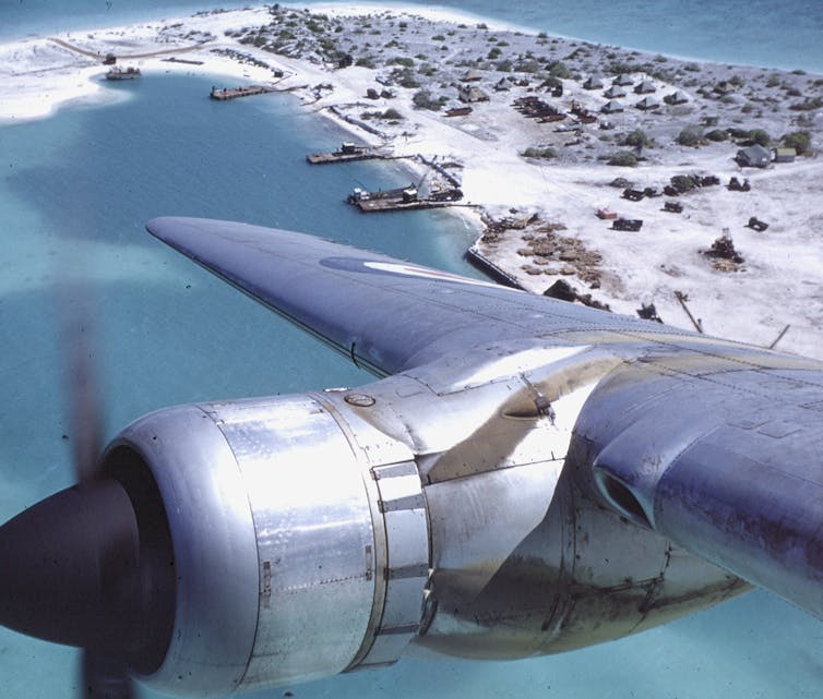 Flying over Kiritimati in 1956. Photo by Dennis Hobbs