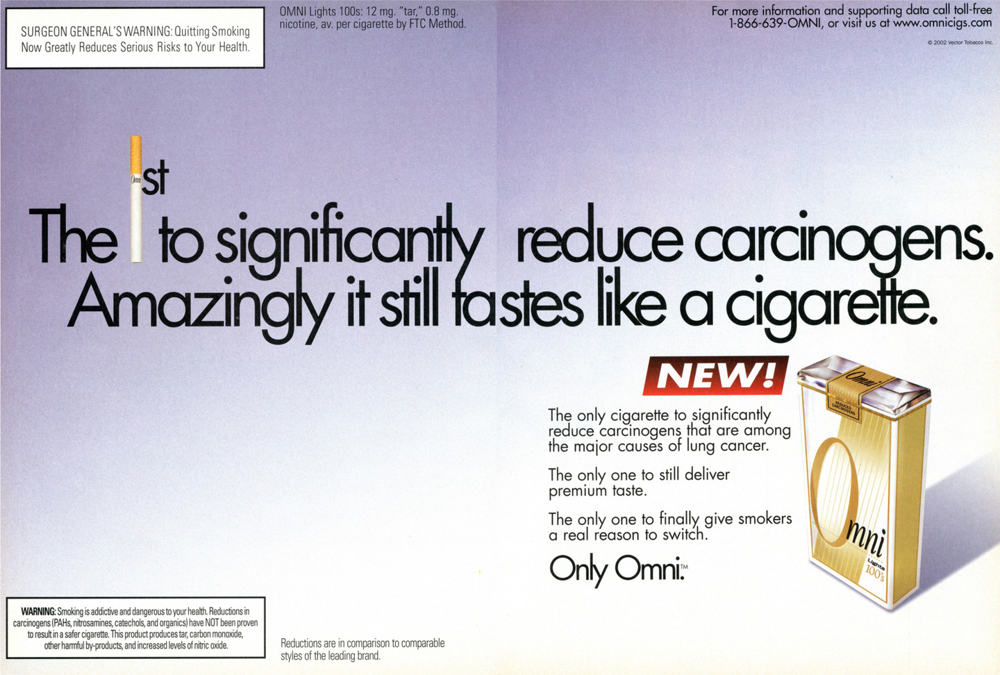 In more recent years, we saw a series of failed attempts by tobacco companies to interest smokers in switching to “reduced carcinogen” cigarettes such as Omni (see the ad below) and products which heated rather than burned tobacco (“Introducing Premier, the remarkable new cigarette that offers you a genuine alternative”), delivering a vapour into smokers’ lungs.