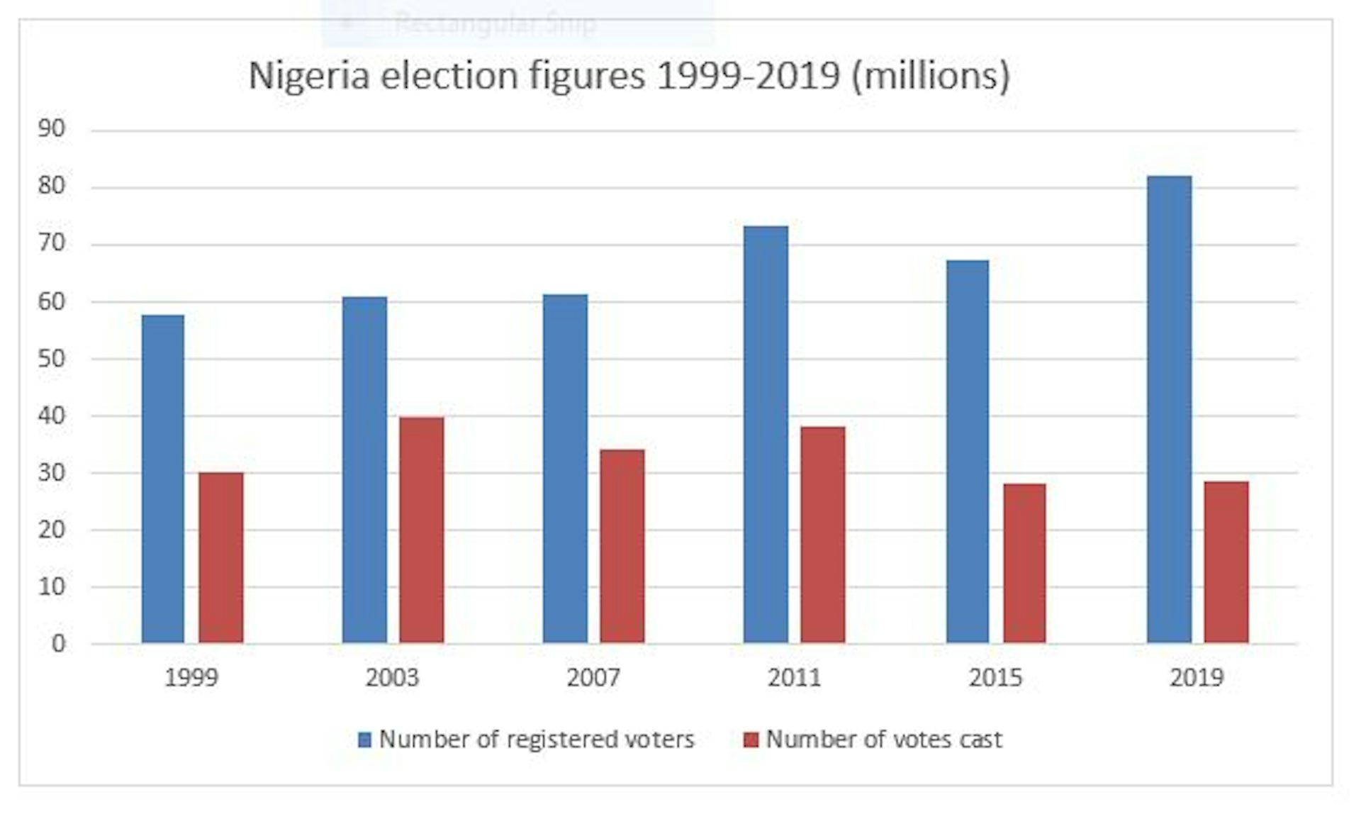 Fourth, the tense atmosphere around the country coupled with a heavy military presence in some parts limited voter’s turnout. This resulted in a record low of 35.6%. The numbers of registered voters rose from 57.9 million in 1999 to 84 million in 2019. But turnout continued a decline that’s been clear since 2003. In that year the turnout was 69.1%, four years later in 2007 it was 57.4%, in 2011 it was 53.7% and in 2015 43.6%.