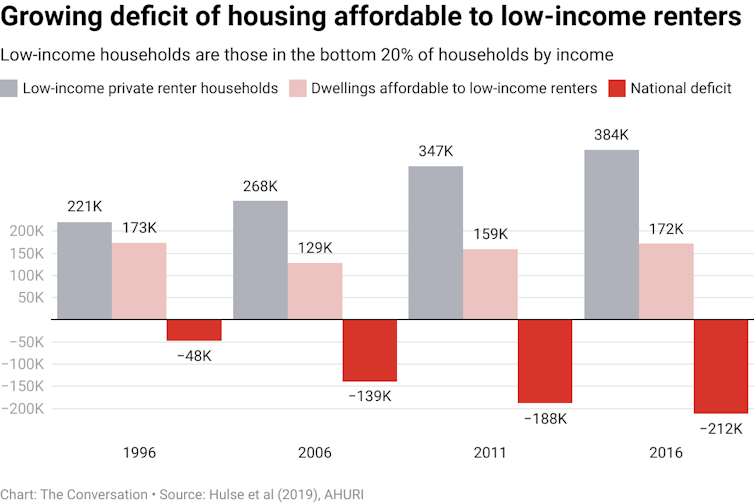 Decades of mounting rent assistance expenditure have failed to fill the gap created by the lack of a sustained national program of social housing construction since the 1990s. Research shows the shortfall in private dwellings affordable to low-income renters ballooned from 48,000 in 1996 to 212,00 in 2016.