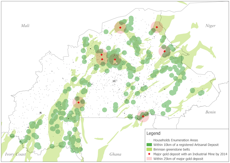 To try to understand the reality of the “natural resource curse” around artisanal and industrial mines, we compare in the article the standard of living of households living in the immediate vicinity of mines with the situation of those living further, before and after the mining boom. We look at household consumption, which is the best indicator of their economic resources in the absence of reliable income data. We benefit from geocoded data on surveyed households, industrial mines, declared artisanal mines, and geological zones of formation of Birimian green rocks, which constitute the main geological formation explaining the development of gold in Burkina Faso (see figure 1).