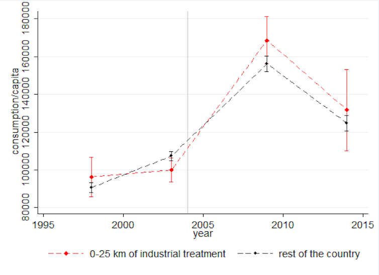 We do not observe any significant differences in consumption trajectories between households living within 25 kilometres of industrial mines and other households (see Figure 3). We thus observe no effect of industrial mines on the standard of living of local populations. This result is consistent with the work of Alfred Hirschman, who describes extractive activities as “enclave” activities with little effect on local development.