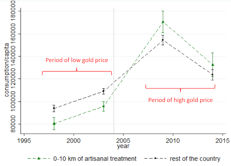 Our results indicate that artisanal mines have a strong positive effect on the standard of living of local populations. A 1% increase in the price of gold raises household consumption by 0.15%. During the gold price boom (2009 and 2014), these households consumed 10% more than households not living in close proximity to mines. Figure 2 summarizes these effects by comparing household consumption before and after the gold price explosion.
