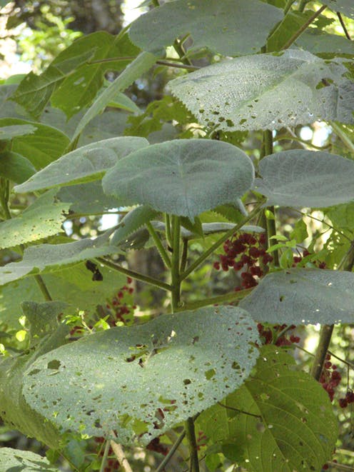 I studied two species for my PhD, Dendrocnide moroides and Dendrocnide cordifolia which is often mistaken for Dendrocnide moroides. Both species are shrubs that grow to three metres with heart-shaped, serrated-edged, dark-green leaves that can grow from the size of a thumbnail to over 50 cm wide.