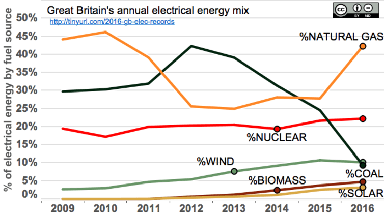 Putting together renewables, nuclear, and imports from France (which are almost all nuclear and hydro), Britain hit the milestone of supplying more than half its electricity from low carbon sources in the summer of 2016, up from 20% in 2010.