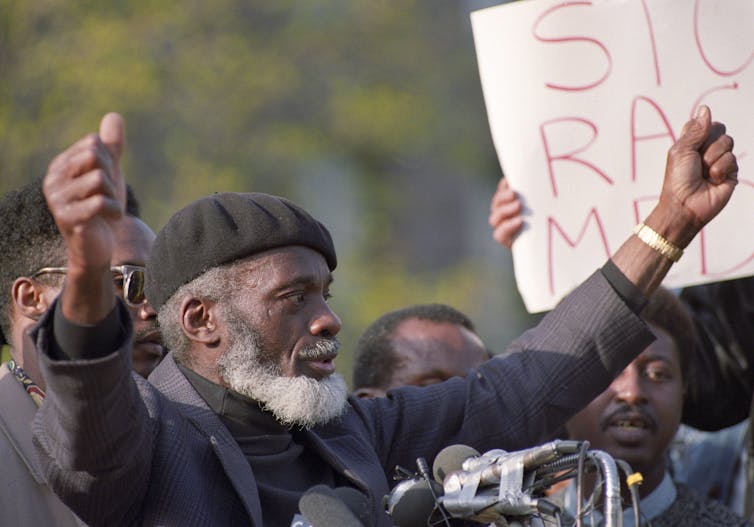 Dudley Laws, a founding member of the Black Action Defence Committee, speaks to an anti-racism rally at Queen’s Park in Toronto on May 8, 1992. Laws died in 2011 at the age of 76. The Canadian Press/Hans Deryk
