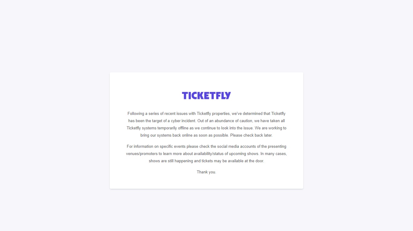 Upon opening the website, patrons will be met with an advisory, which reads, “Following a series of recent issues with Ticketfly properties, we've determined that Ticketfly has been the target of a cyber incident. Out of an abundance of caution, we have taken all Ticketfly systems temporarily offline as we continue to look into the issue.”