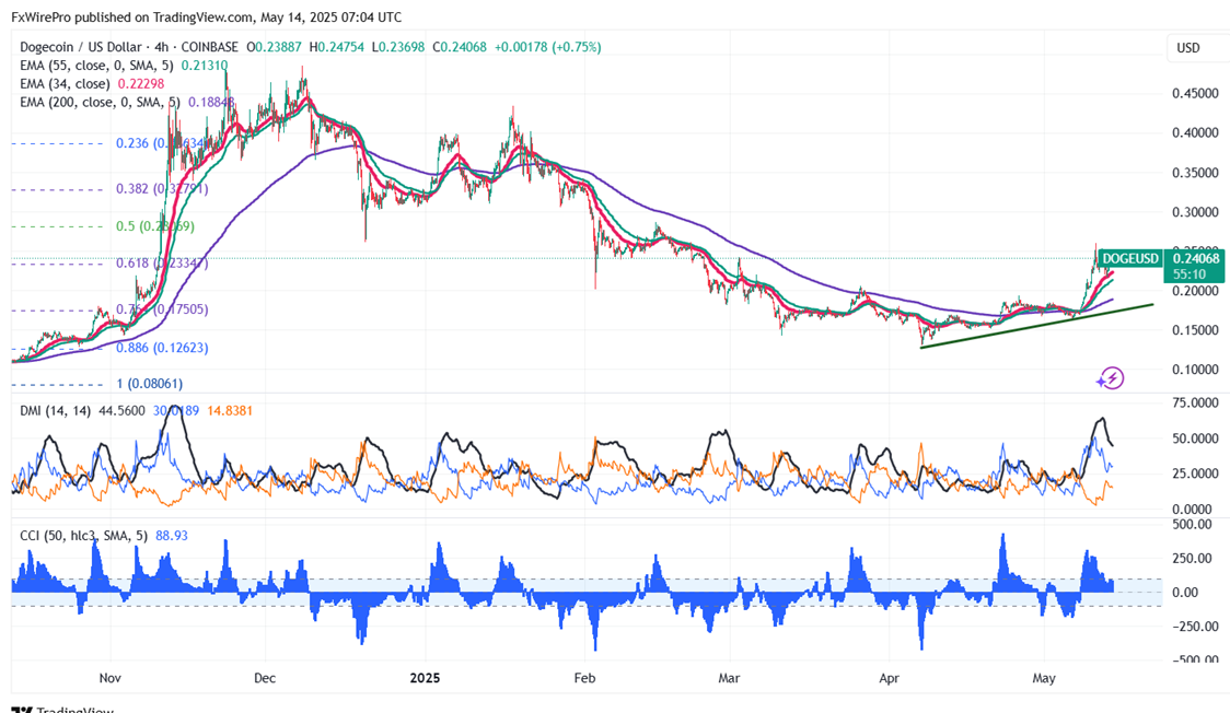In the 4-hour chart, the pair is holding above short-term (34 and 55-day EMA) and long-term 200 EMA ($0.1879).