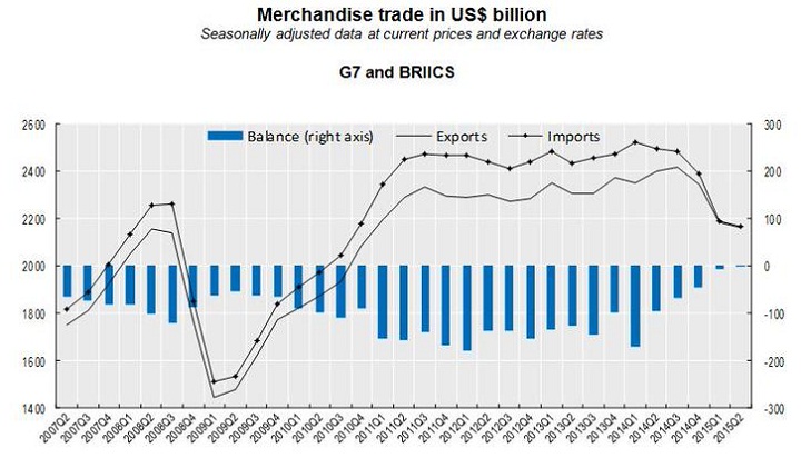 - Total G7 and BRIICS international merchandise trade, in current US dollars, continued to contract in the second quarter of 2015, with exports and imports declining by 0.9% and 1.2% respectively, compared with the previous quarter.