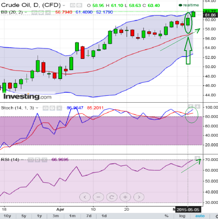 The crude oil's May month contracts at Multi Commodity Exchange of India Limited (MCX) look more profitable after a mild consolidation of oil prices has resumed its prospect bullish trend. We also figured out "bullish engulfing" candlestick pattern on daily charts.