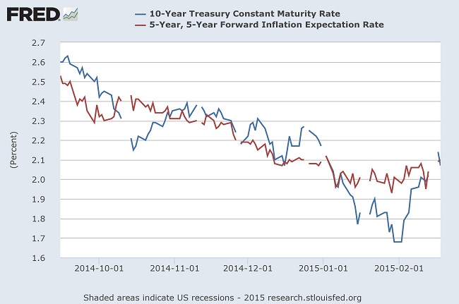 The chart is of benchmark US 10 year treasury yield and inflation expectation measured by 5 year forward rates.