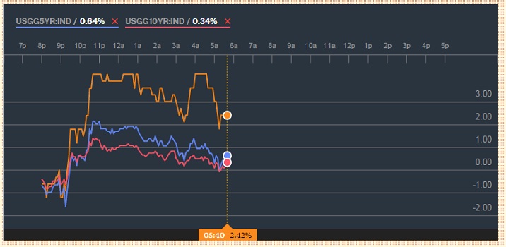 - 2 year treasury yields are up 2.42% as shown figure, trading at 0.68%