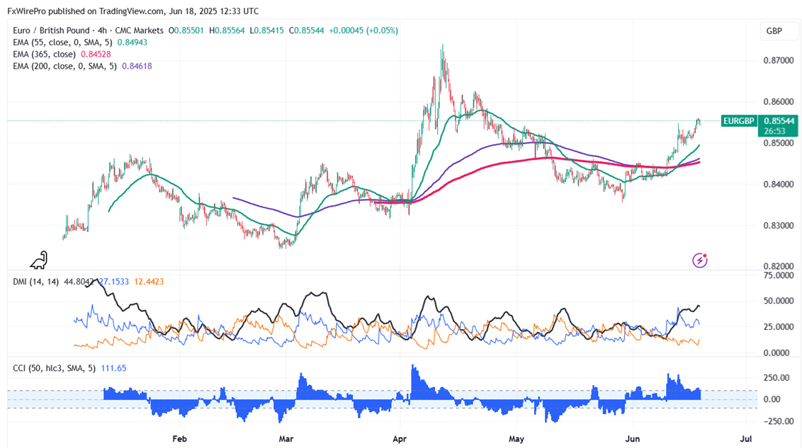 EURGBP holds above 0.8550 as weak UK CPI increased the chance of a rate cut by the BOE in the near term. Intraday bias remains bullish as long as support 0.8480 holds. It hits an intraday high of 0.85601 and is currently trading around 0.85541.
