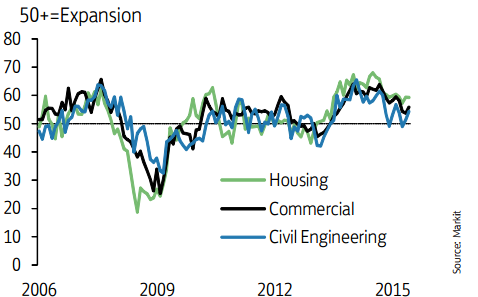 The weakening of the PMI series in the first half of the year reflects a slowdown in both housing and commercial activity. Last month's rebound was led by the commercial sector but recent signs of life in the housing market, with transactions rising, point to a likely rise in construction in that sector.