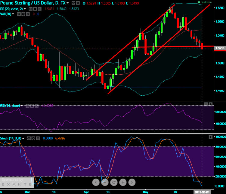 The GBP/USD has been slid to 0.44% to 1.5200 from around 1.5268 after manufacturing PMI data printed at 52.0 which is below forecast at 52.7 level.