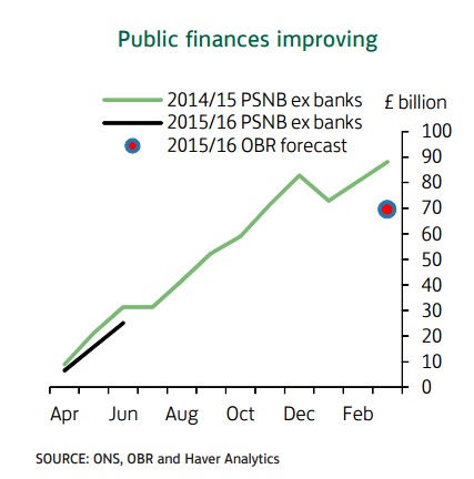 "For July, we look for net repayment of £1.0bn on the ex banks measure, an improvement on net borrowing of £0.1bn in 2014/15, and a repayment of £1.8bn on the headline measure," notes Lloyds Bank.