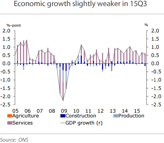 According to the preliminary estimate, economic growth fell back to 0.5% q-o-q in Q3 2015, after a rise of 0.7% in Q2. Growth was registered in three of the four main sectors. Output in services increased by 0.7% q-o-q and contributed 0.6% to GDP. Construction output, conversely, was a large drag on economic growth. The 2.2% q-o-q drop reduced GDP growth by 0.14%. The sector was likely harmed by rainy weather in August.