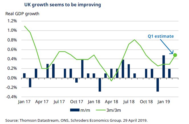 A cautious approach to analysing the momentum of the UK economy will be required in coming months. The improvement in monthly GDP figures appears to be driven by stockpiling, and not final demand. This may have been a reaction to Brexit uncertainty, but is still likely to lead to a slowdown in growth in the near future. Meanwhile, leading indicators of activity in the services sector suggest a slump could be on the horizon, Schroders further noted.