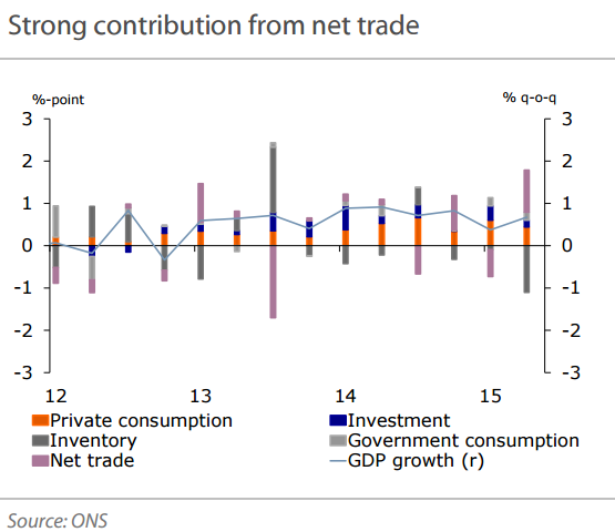 Data last week showed that Britain's dominant services sector grew at its weakest pace in over two years in August. The second estimate of UK Q2 GDP confirmed that the British economy expanded by 0.7% q/q in the second quarter of 2015. All components, except inventory formation, contributed positively. Latest data also showed British wages excluding bonuses rose by 2.8 percent in Q2, the biggest annual real-terms rise since mid-2007, while total employment edged down from the first quarter's record high. On average, nominal wages increased by 2% over the last year, while labour productivity all but stagnated in 2014 (+0.1%).