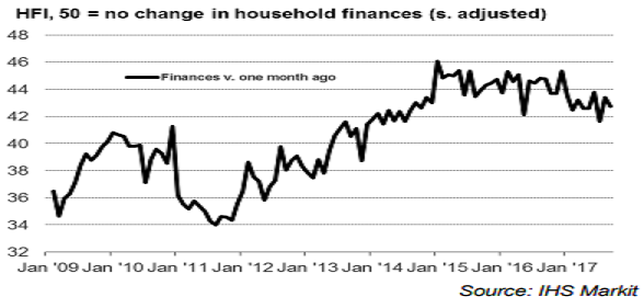 The United Kingdom’s households experienced sharp deterioration in household finances, with the average HFI reading in Q3 2017 being the weakest in three years. This is largely owing to rising living costs and subdued pay growth amid fall in the cash availability to spend.