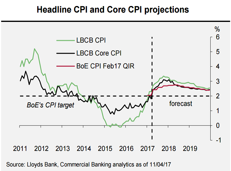 "A sharp rise next month - the echo of the Easter timing effect and boosted by the rise in insurance prices reflecting the change in the personal injury discount rate - will presage an expected peak in CPI inflation of 3.3% by 2017 Q4," said Lloyds bank in a report.