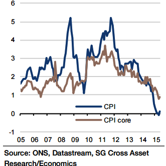 "The downward impact is greater than the fall in petrol prices alone would suggest. The overall result of these core and non-core developments should be to have driven down inflation from +0.1% yoy to -0.1% yoy", says Societe Generale.
