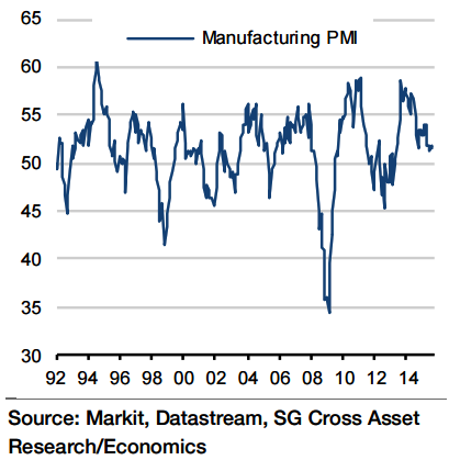 "In this month's PMI survey the PMI is expected to decrease again from 51.5 to 51.1", says Societe Generale.