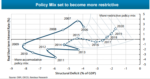 Over the next two years, fiscal consolidation will be material and predominantly affect areas such as tax credits, housing benefits, operating expenditure and defence spending. Accordingly, the Bank of England will have limited opportunity in the short run to hike rates "normally" as the policy mix will remain dominated by fiscal policies.
