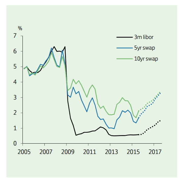 For now, the majority of MPC members appear to be attaching significant weight to these heightened downside risks to inflation. Although, the latest Inflation Report reported the Bank's 'best collective judgement' that annual CPI will be modestly above the government's 2% inflation target at the end of the forecast horizon, the near-term profile is appreciably softer. The arguments for hiking interest rates sooner rather than later remain compelling and could reduce the need for a more aggressive pace of tightening later - particularly if, as expected, the US Fed raises interest rates next month. For the majority of the MPC, however, there is clearly less urgency and the MPC's latest forecasts and narrative suggest that the MPC will now wait until the first half of next year to start raising interest rates - most likely until February. By then, some of the relative price shifts that have kept inflation in check should have started to unwind, the economy should have recorded two more quarters of decent growth and some of the international concerns should have dissipated. The gradual normalisation of UK & US monetary policy is forecast to push yields higher over the medium term.