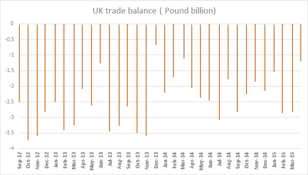 - The UK's deficit on trade in goods and services was estimated to have been £1.2 billion in April 2015, compared with £3.1 billion in March 2015.