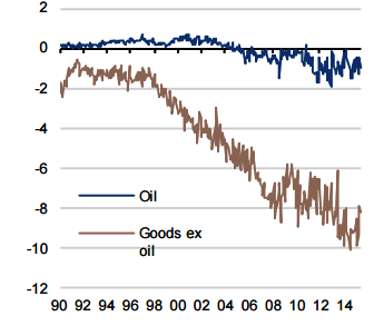 Within the total deficit, the most heartening feature of late has been the contraction in the nonoil goods deficit. This development is surprising, given that it has coincided with a fall in exports orders and a dip in world trade growth.