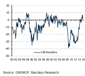 "While consumer confidence remains elevated in light of low inflation, consumers continue to feel moderately less confident about the future. This supports our macro scenario whereby private consumption is strong, and the primary driver of economic growth, but eases into H2 15 and 2016", added Barclays.