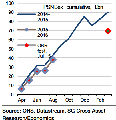 "Moreover, this also means that interpretation of the year-to-date performance should be cautious as implying that the full year projection will be missed. For September the deficit will be the same as a year earlier at £11.0bn", says Societe Generale.