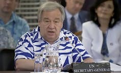 UN Secretary-General Antonio Guterres addresses the Pacific Islands Forum in May 2019 in Suva, Fiji. Fiji Broadcasting via AP