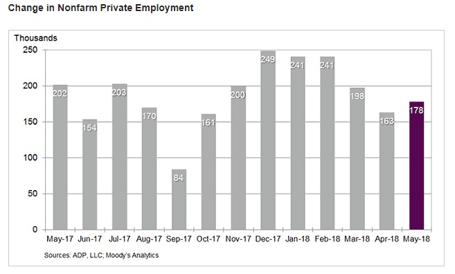 - Non-farm private sector employment grew at 178,000 in May, the median expectation was for 190,000.