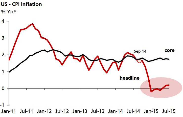 At least that what's markets expect for today's CPI report. Both core and headline prices are expected to advance by 0.2% (MoM, sa) in July, which would leave core on-year inflation at 1.8% YoY and lift the headline measure by a single tick to 0.2% YoY.