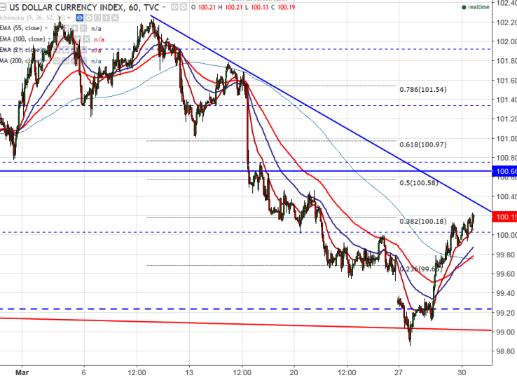 - DXY has taken support near 61.8% fibo and jumped sharply above 100 level. The index recovered till 100.19 at the time of writing and it is currently trading around 100.06.