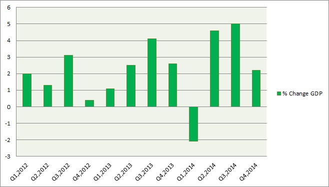 - US has so far been on solid growth path, rising 5% and 2.2% in previous two quarters. Annual growth rate in GDP stands above 2%. Historically speaking US GDP usually falters in the first quarter.