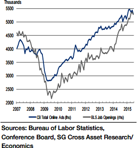 "Of particular note, the gap between the two job postings series has almost completely evaporated from the "all-time" high of 1.16 million at the end of 2012", says Societe Generale.