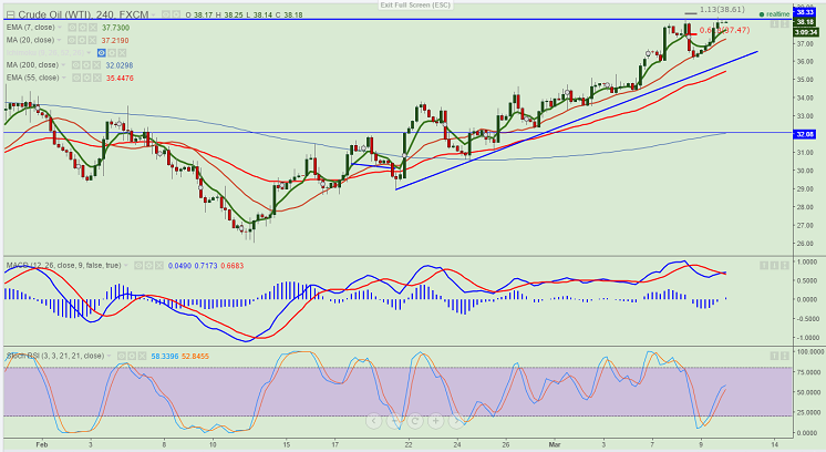 - US Oil has broken major resistance $38.40 and jumped till $38. is currently trading around $38.22.