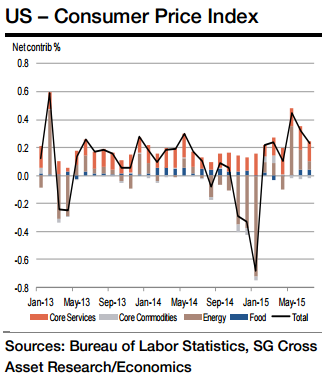 Societe Generale estimates, "The overall and core CPIs are expected at 0.2% and 1.8% above their respective yearago levels. Looking ahead, declines in gasoline prices since July could knock 0.3 percentage point off the headline CPI in August."