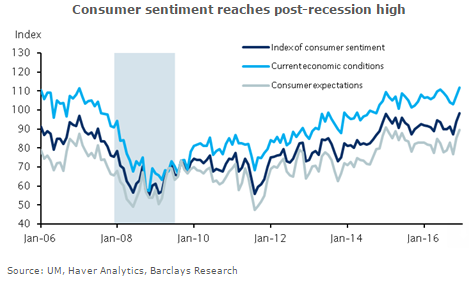 "Ongoing solid readings on consumer confidence reinforce our view that GDP growth should remain firm in the near term, and we see the level of confidence as consistent with ongoing strength in consumer spending," Barclays Research said in its latest research note.