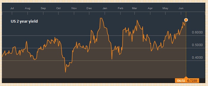 - Before the retail sales data was released 2 year yield was trading around 0.725%, a level not seen since December last year. From mid-May yields in short end are rising steadily from 0.53% to 0.73% as of today.