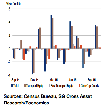 "Powered by an anticipated surge in transportation equipment requisitions, durable goods bookings likely climbed by 3.5% in October, recouping all but a fraction of the 4.1% decline recorded over the August-September span", estimates Societe Generale.