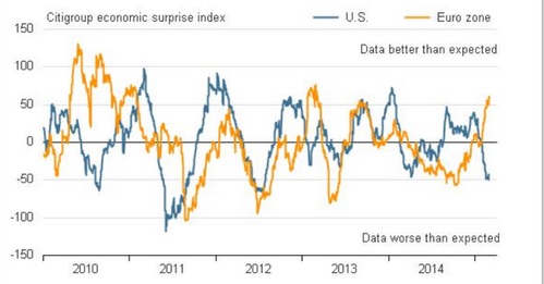 This not necessarily mean US economy is going down while rising in Europe but data forecasters are too optimistic over US and too pessimistic on Eurozone. Nevertheless implications are noteworthy.