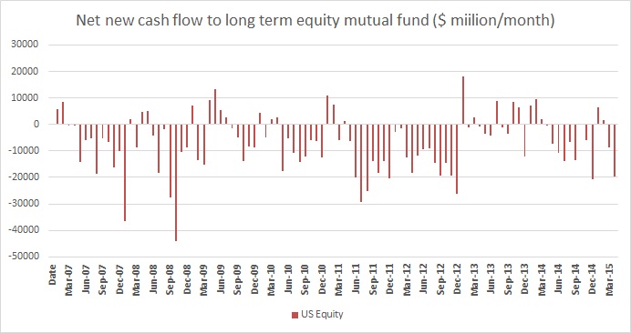 - The above chart shows flows of Money to US long term mutual funds. This year US funds are seeing massive outflow of money last seen during 2011-12 when market was in turmoil.