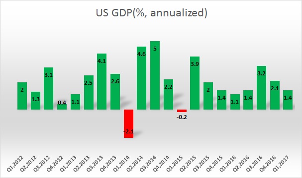 The growth in the United States has been revised upwards in the final reading of the GDP number today. The US economy grew at a substantially swifter pace in the first quarter than first thought, according to a third reading on gross domestic product. The US Commerce Department said that the world’s biggest developed market expanded at an annualized rate of 1.4 percent in the first three months of this year, which is a step up from the first estimate of 0.7 percent, and the second estimate of 1.2 percent. This is also the best reading since the first quarter of 2014, when economy grew by 2.2 percent.
