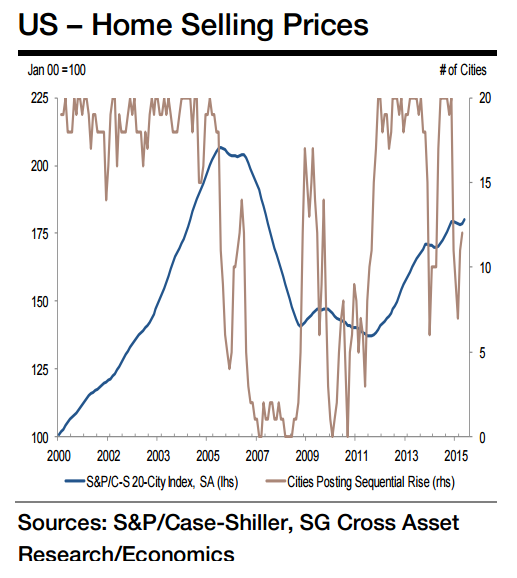 "Our projection, if on the mark, would leave home prices approximately 13% below their pre-Great Recession high", says Societe Generale.