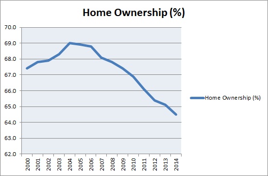- Low home ownership - FED started lowering rates at the height of crisis in 2008, when unemployment remained near 10% level. Housing would have been last thing on mind of consumers, who deterred from big time investments. Actual benefit was for companies that used lower rates to buy houses and rent them away. As an evidence of this is US home ownership, that is actually going down and hovering below 65% when for developing economies like India, rate is much higher above 80%. Private equity firms are now the largest landlords in US.