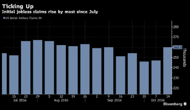 U.S. initial jobless claims increased by 13,000 to 260,000 in the period ended Oct. 15, data released by the Labor Department showed Thursday in Washington. The median forecast in a Bloomberg survey of economists called for 250,000. Continuing claims also rose, though the four-week average was the lowest since 2000.